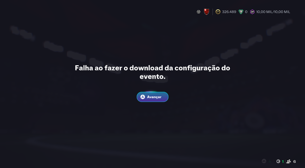 2) No Ultimate Team estou com dificuldades para acessar e jogar eventos atuais (Desafios, Troca de Ídolo, etc.). Geralmente consigo jogar apenas uma partida. Ao tentar iniciar a próxima, aparece a mensagem "Falha ao download de informações do evento" após ficar em "Carregando configuração do evento".