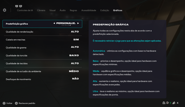 É extremamente frustrante toda vez que vou iniciar uma partida ou reinicio o jogo, ele simplesmente altera sozinho as configurações gráficas. Eu deixo as configurações personalizadas com algumas opções no alto, outras no médio e algumas no baixo mas, assim que reinicio o jogo, tudo volta automaticamente para o alto ou até mesmo para o ultra. É muito cansativo ter que ajustar tudo novamente toda hora. Por favor, arrumem isso o quanto antes! Não sou o único passando por esse problema várias pessoas estão enfrentando a mesma situação em relação à otimização do jogo. Pelo amor de Deus, corrijam isso logo!