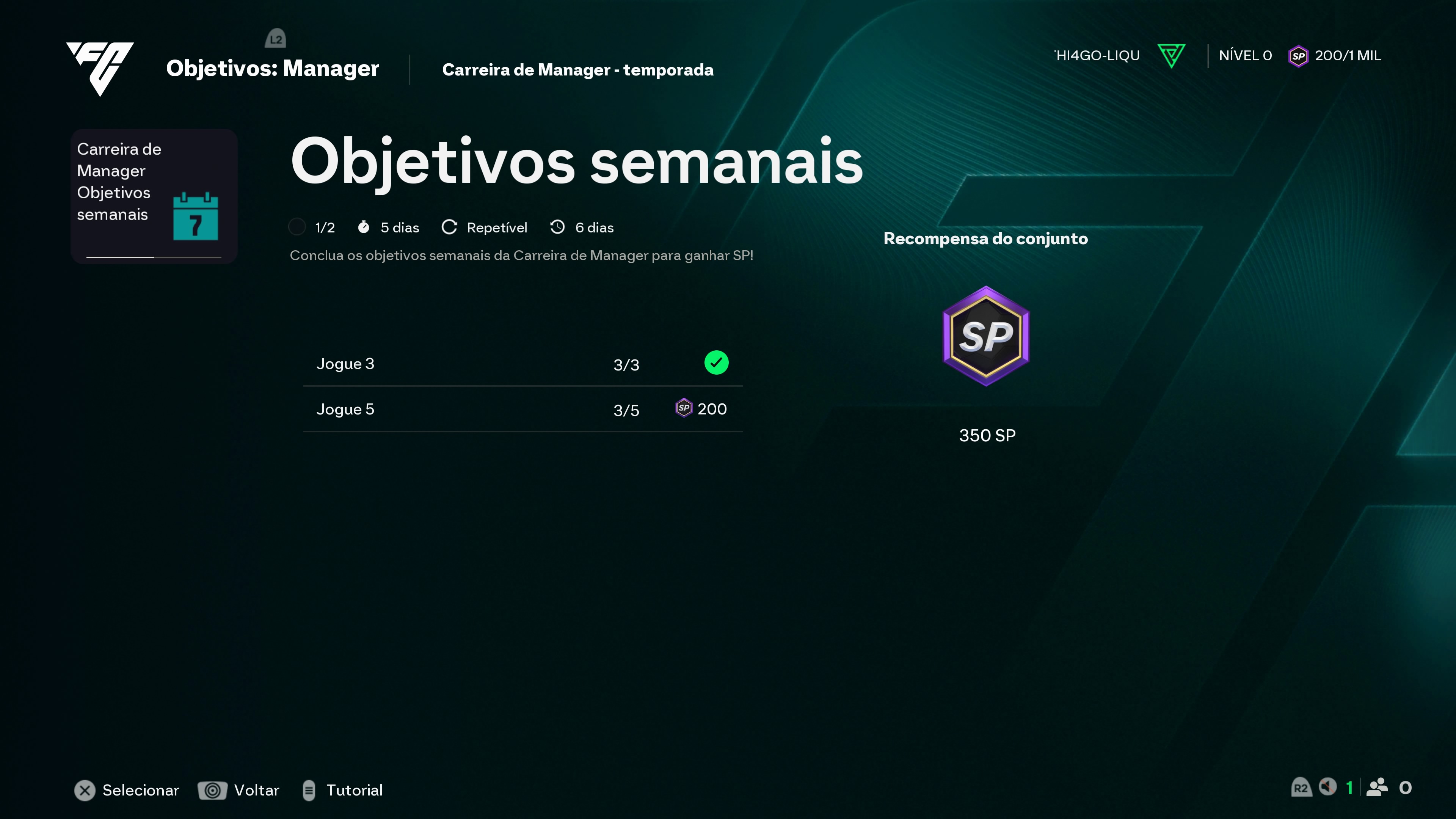 Jogo EA FC 26 no PlayStation 5 e no PlayStation 4, e os objetos do Passe no geral, aparecem normalmente, porém, na sexta-feira quando atualiza os objetos Semanais de SP do modo carreira de Manager e de Jogador já automaticamente aparecem como concluídos sendo que eu nem joguei, basicamente fica congelado o objetivo e não dá para concluir e acabo perdendo um total de 1500 SP por semana, me impedindo de progredir no Passe. Eu consegui fazer os Objetivos na primeira semana do jogo, no dia 19 de setembro, mas nas semanas seguintes, no dia 26 de setembro e no dia 3 de outubro, os objetivos ficaram congelados e perdi um total de 3000 SP em duas semanas. O bug fica permanecendo durante toda sexta-feira e se estende até a próxima sexta-feira e continua repetindo o ciclo e nunca é resolvido durante a semana. Na minha conta principal que comprei o Passe Premium (THI4GOG4MERFT), está com o bug, mas em contas secundárias em que não comprei o Passe Premium, (yTHI4GO-LIQUID) o bug não acontece. Eu comprei a versão Premium e gostaria de concluir para não perder dinheiro, para isso, preciso que o bug seja resolvido, o problema é que o dinheiro já foi gasto e a temporada e o tempo está acabando, se tiver ajuda, ficarei grato. Abaixo, está anexada imagens tiradas do meu console.