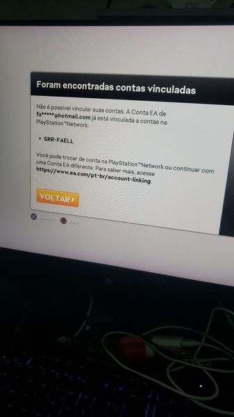 Pela indicação da mensagem parece que a sua conta da Playstation já esta vinculada em alguma outra conta EA verifique na pagina de conexões da sua conta EA se encontra o vinculo feito. Se o problema continuar sugiro falar com o nosso suporte para que verifiquem a sua conta.