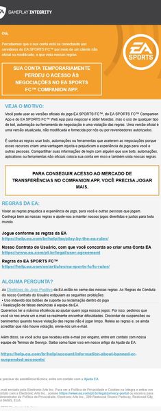 A saga piora agora... É O PIOR SUPORTE QUE UM JOGO PODE TER, não em razão dos funcionários, esses são nota 1.000. Porém a EA limita a funcionalidade do suporte, não conseguem olhar nada, não conseguem dar nenhuma informação. Se vai no chat, falam que não podem fazer nada, nem conseguem olhar a motivação/duração da suspensão. Se vem nesse chat mandam abrir um ticket/contestação, também não tem um suporte adequado para um jogo desse tamanho. Eu me sinto abandonado pelo jogo. Vamos acabar com o empurra empurra de suporte online, mandando abrir ticket(que não funciona pra **bleep** nenhuma), fórum que só os funcionários só tem resposta automática mandando iniciar o loop de abrir contestação. EA MELHORE A QUALIDADE DOS SUPORTES, TIREM SUAS LIMITAÇÕES!!!