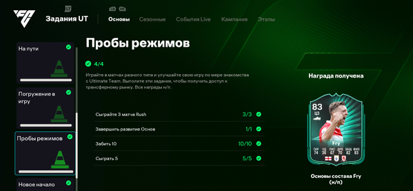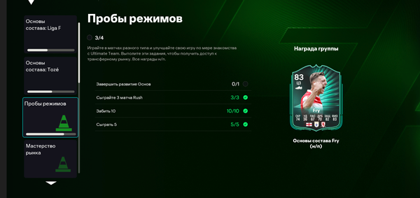 Не завершается группа заданий "Пробы режимов" хотя сыграл уже много матчей, в разных режимах (rush, rivals, против ии, развитие игроков тоже пробовал много раз), соответственно уже неделю не могу пользоваться трансферным рынком