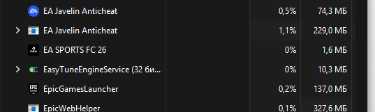 Всем привет! Помогите, пожалуйста. Вчера купил ФК. Скачал, запускаю, появляется окошко античита, и ничего. Игра висит в диспетчере устройств с потреблением памяти 1.6 МБ, а сама не запускается. Я уже 3 раза переустанавливал: на SSD, с SSD и опять на SSD — ничего не помогает. У меня нет "КриптоПро" или чего-нибудь такого. (мои характеристики CPU RYZEN  5 5600 Мать плата А520М К V2 Видеокарта 1070 TI 32 Гб памяти у меня win 11 тоесть сразу выключены не нужные вещи в биосе secure boot включен) Пожалуйста помогите Я приложил 2 фото с фк в диспетчере и кучей еа (может это ошибка)