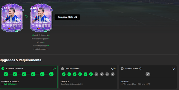 I don't know if EA have forgot about Francisco Moura Fut Fantasy but he isn't getting the upgrades he should. For example FC porto have had a clean sheet and he hasn't had his 2 playstyle upgrade. The card was activated on February 20th and FC Porto got a clean sheet by beating Rio Ave 1-0 on February 22nd