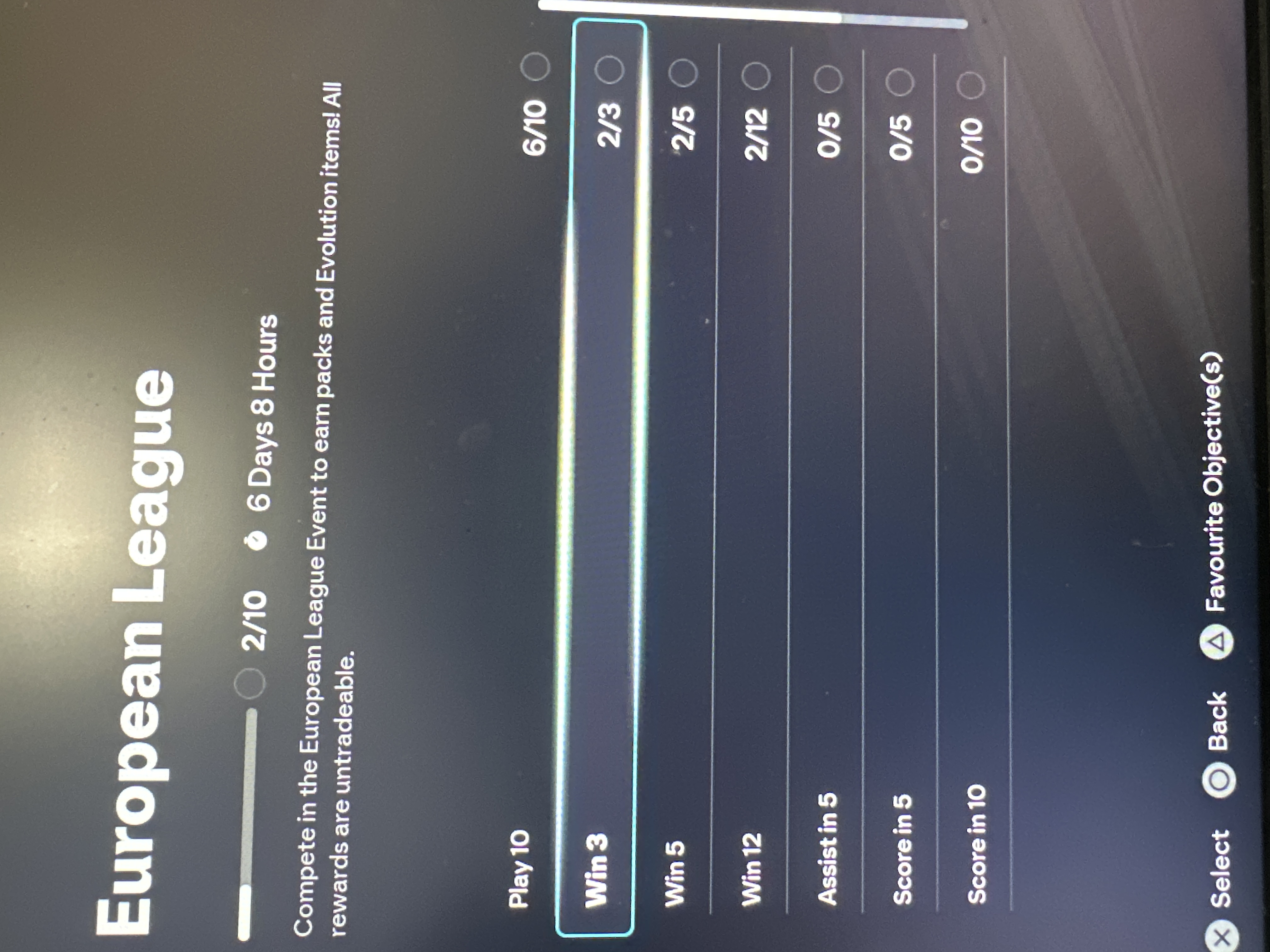 Hello I was completing the objectives for EUROPEAN LEAGUE AND 3 objectives are not being tracked for that game mode, Assist in 5, Score in 5, score in 10. The Objectives were done with a partner inTHE EVENT EUROPEAN LEAGUE. I’ve only played 6 games as well and it showing I have 12 attempts remaining when I should have 14 if you could please fix these bugs I would appreciate it.