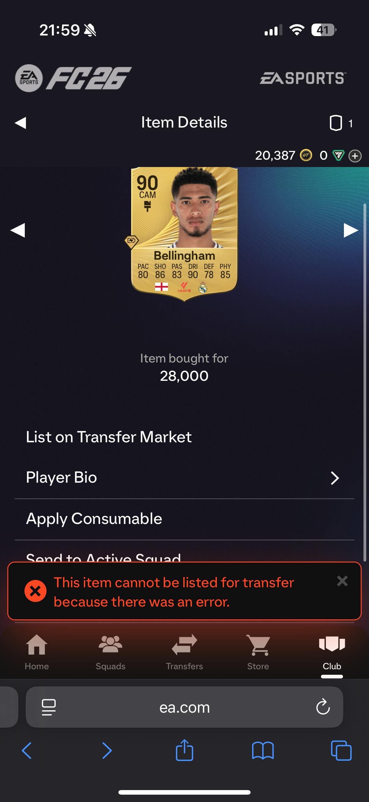 I cannot sell players in my club, i can sell items i get in new packs. For example i cannot sell my player: Shaw rating reload card i think there is a problem because i have the special Shaw card in my active squad and also as sbc, i also have the normal shaw card. I cannot sell the special Shaw card for some reason.. its been 2 days already please help! The picture is after i try putting it in on the transfer market. If i try sending it to the transfer list, its says it moved to the transfer list, but its not there!!