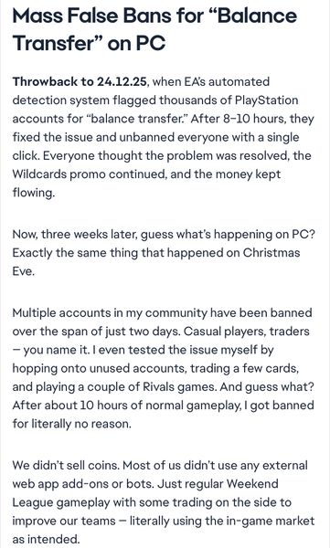 I switched mid December to pc and got banned not just market ban but full on can’t connect to ea servers Jan 31st for supposedly buying or selling coins and I barely even unlocked the transfer market like maybe 5 days before my ban I packed tradable Ronaldinho and sold him and use the coins to buy pack in the store and that really all the selling I’ve done in the market usually just buy packs and play after work or when I get the chance! I appealed and got denied but I haven’t bought or sold coins or would risk my account by doing that with the money I put into my team and I’m just at a loss that I can’t talk to actual human just have to put my trust into some bs detection security! I just want my account back I miss being able to play super unfortunate this has been a continuous issue for the community can any actual ea employee help or find answers for me? EA_Aljo EA_Hux EA_Mio EA_Vendcera EA_Darko