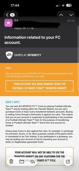 After 2 days I got this email today banning me from the transfer market on top of the on wipe!