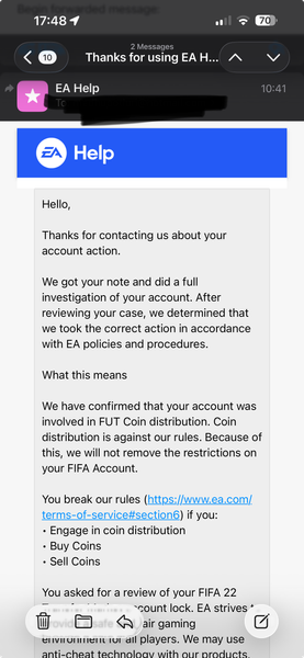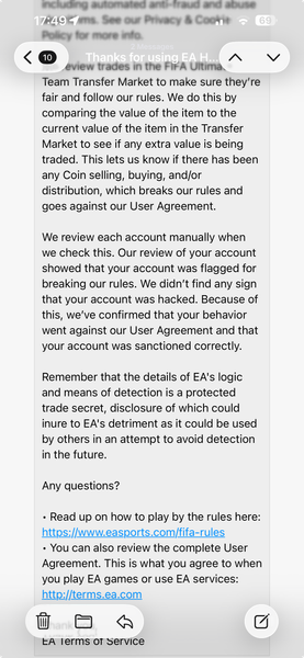 The point of this post is to make this issue public and hopefully get it noticed by someone at EA. Many people have lost their time, money, and nerves. EA Help’s policy is based almost entirely on automated responses, so when you try to appeal a ban, you’re stuck resending the same message only to get rejected by a bot 24 hours later. It’s incredibly frustrating.