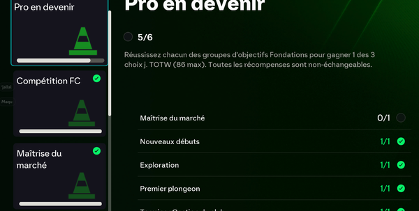 Bonjour, je fais ce message car ca fait depuis le début du jeu que j'ai finis le groupe d'objectifs pro en devenir mais il ne veut pas se valider à cause du défis maitrise du marché alors que j'ai bien complété le defi.