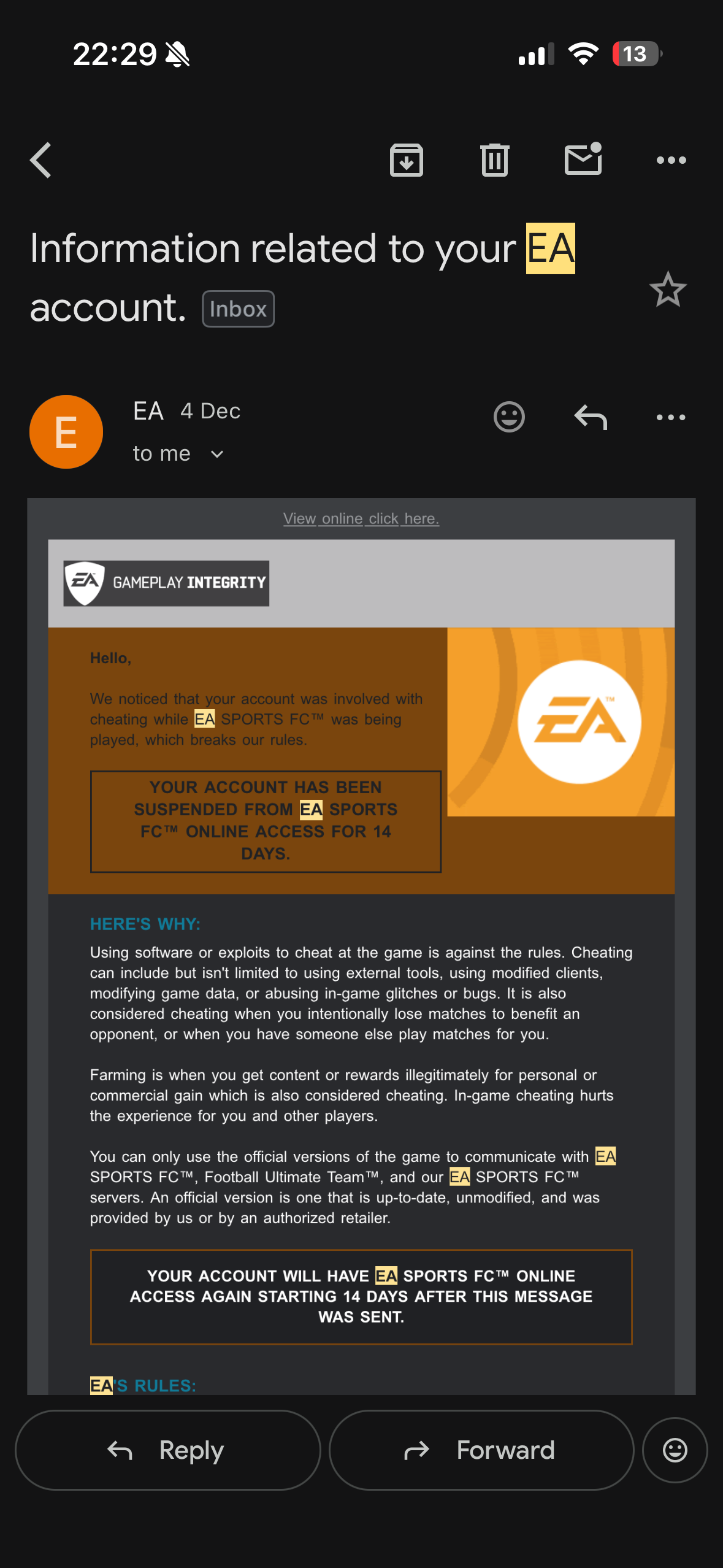 I’ve been playing fifa for years now and at no point have I ever violated the rules. On the 4th or December 25 I got an email that I was banned for 14 days then minutes later I got another with red banner that I’m banned permanently because of cheating, apparently I used a software to cheat.