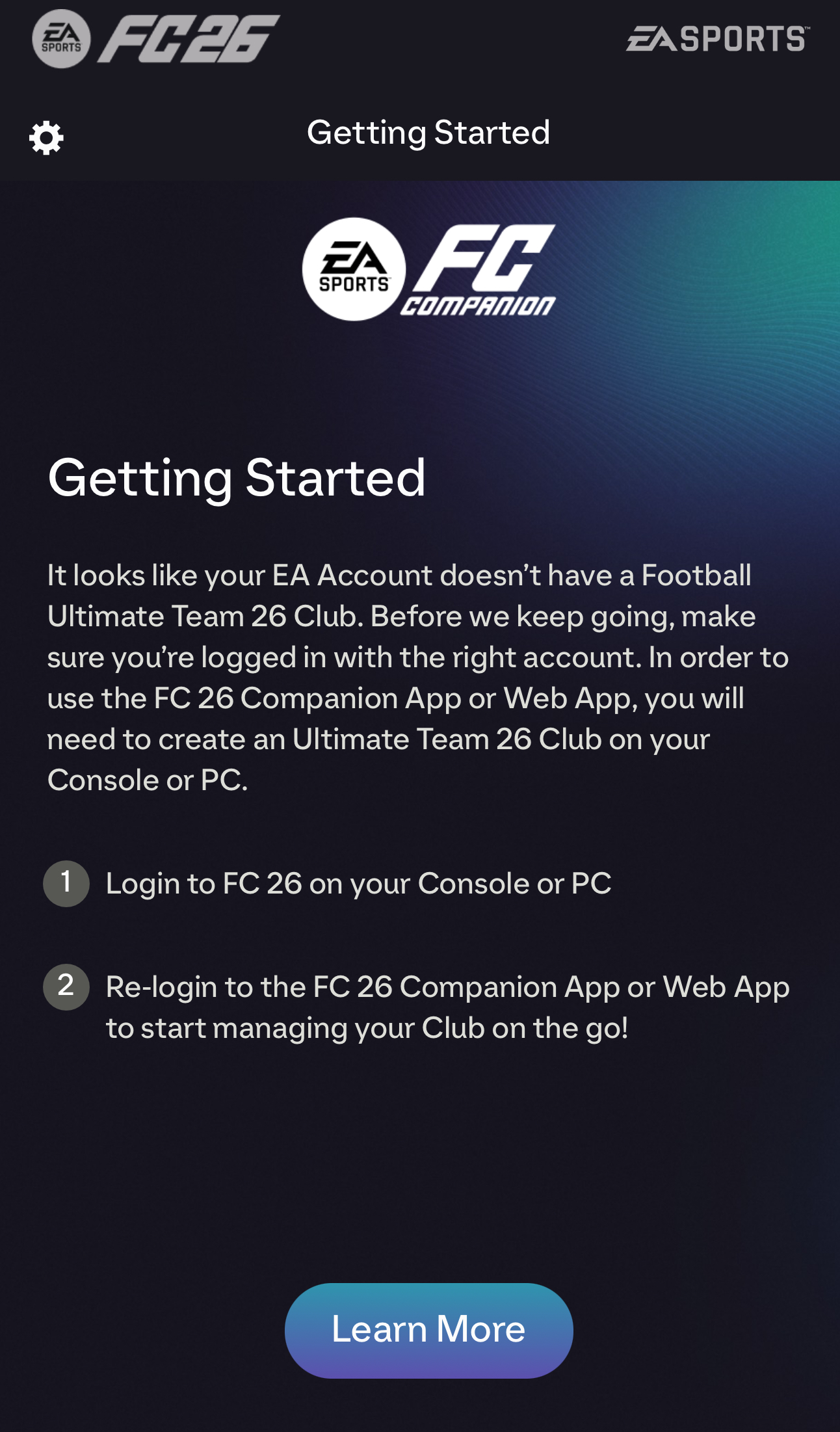 I was able to use the FC 25 Companion App with my EA account, but now when I try to log in to the FC 26 Companion App, I get a message saying my account doesn’t have an Ultimate Team 26 Club. The problem is that FC 26 hasn’t been released yet, so I can’t create a club on console/PC. Interestingly, when I log in with another account, it works fine.