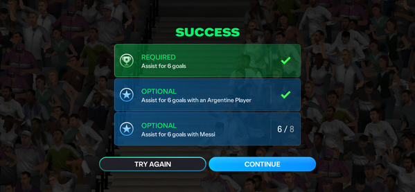 In the record breakers section there is the condition Assist for 6 goals with Messi, but during the match the condition 0/8 appears. In addition, these conditions also appear in the weekend challenge matches. I hope those of us who suffered from this bug will receive a reward.