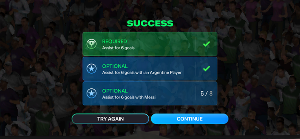 In the record breakers section there is the condition Assist for 6 goals with Messi, but during the match the condition 0/8 appears. In addition, these conditions also appear in the weekend challenge matches. I hope those of us who suffered from this bug will receive a reward.