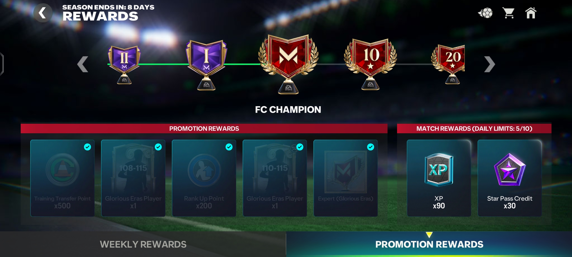 I ranked up from lengendary 1 to fc champion but game got stuck and i didn't receive any rewards. I have attached screenshot where you can see I should have recieved the icon for fc champion in Manager mode but I didn't recieved and also other rewards
