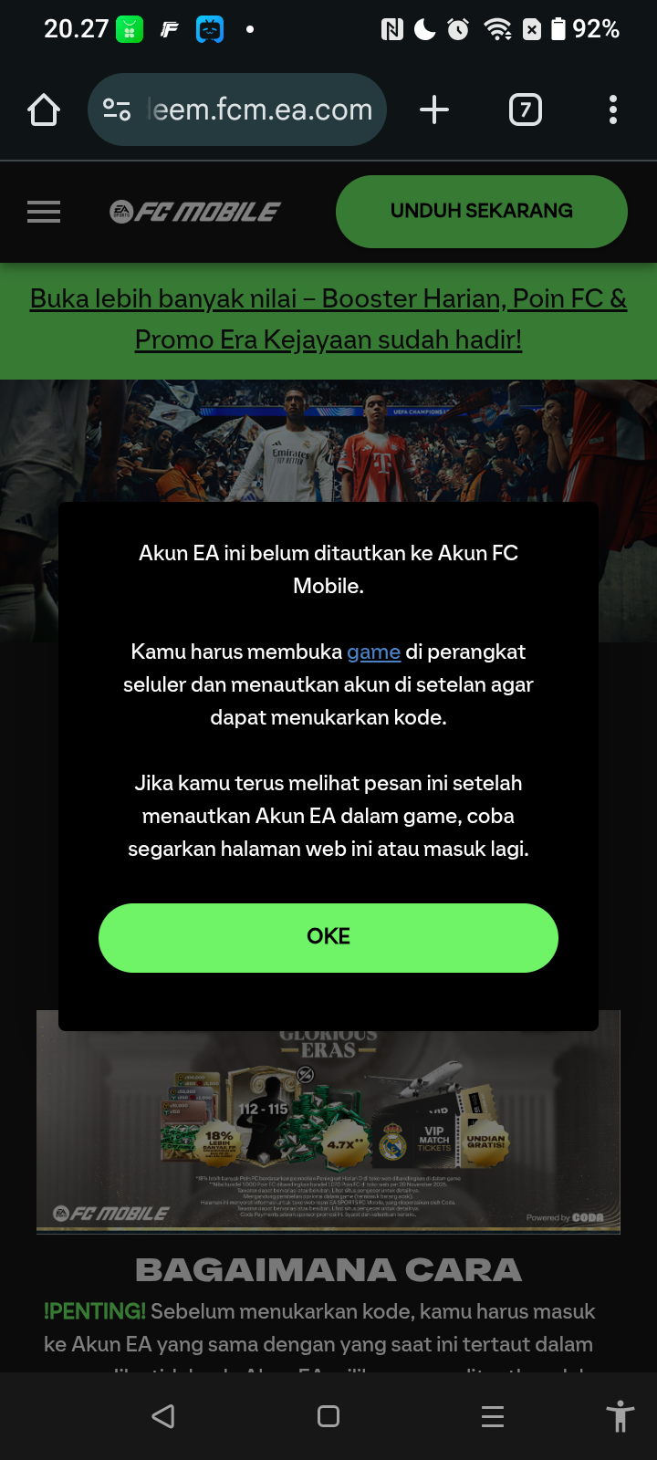 Hi there! Please try opening the page in a new incognito tab, then make sure to log in with the correct EA account—the same one you used to link your FC Mobile game.