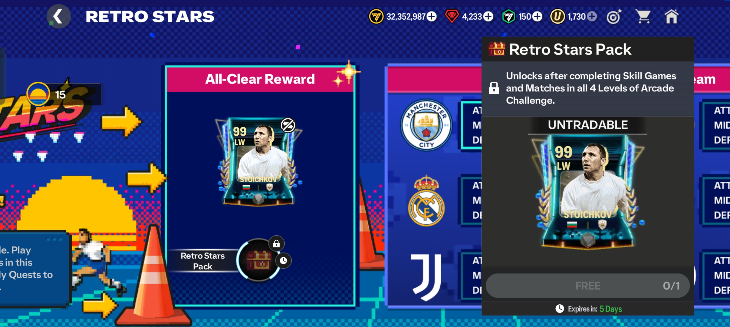 I've completed all the games in retro Stars arcade event, but not able to open stoichkov reward and quest reward for completing lvl 4 games. I've attached the screenshots for reference.