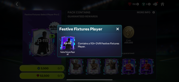 - Bought the Festive Fixtures Select Player Pro C pack for 3,500 FC Points that guaranteed 113-115 OVR Festive Fixtures Player. The pack contained players which weren‘t supposed to be released at that time and were untradable although the pack was supposed to be a tradable pack.