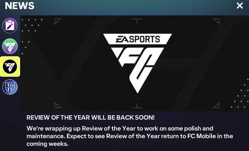 Thanks for sharing your feedback. As mentioned in the in-game News section, Review of the Year will be back in the coming weeks.
