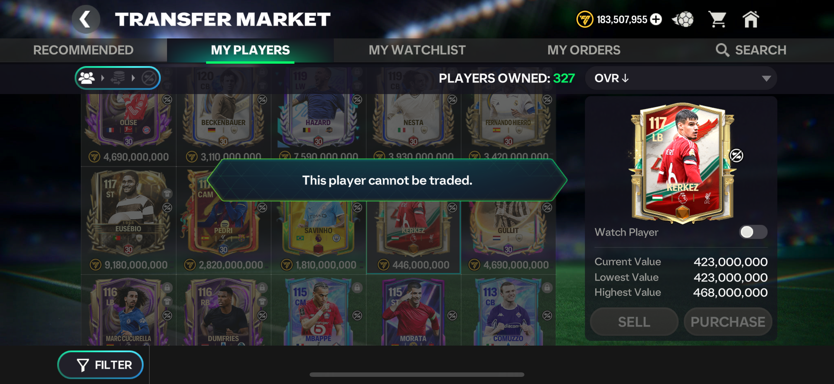 The icons on the right indicate that the item is currently being used in one of your lineups and that it’s untradeable. Please note that an item can become untradeable if you activate it in the Badge section — there’s a warning message you need to accept before activating tradable players.