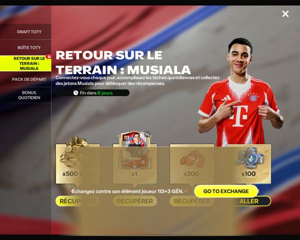 Recent DiscussionsUnable to claim first Musiala prize Can’t seem to make the “Go to Exchange” overlay disappear (even though I’ve utilized the button to go to the Exchange multiple times.). Closed and reopened the app and still can’t get it to go away. ...Error I couldn't receive the award. Still NO Compensation after 3 Weeks for wrongly Untradable Players It’s been over 3 weeks since the bugged Festive Fixtures Select Player Pro C pack was in the shop and there has been no compensation for players who received untradable cards from the Festive Fixture...Toda vez que vou jogar x1 a plataforma fica bufando Toda vez que vou jogar x1 a plataforma fica bufando i cant claim musiala The sentence “go to exchange for his 133+3 OVR PLAYER ITEM”it blocks the rewards i cant claim then pls ea fix them before the event is gone