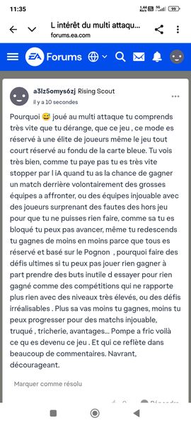 Tu comprends très vite que pour un jeu soi disant gratuit tu n aura rien, tu pourras pas avancer même finir par ne plus pouvoir jouer tellement les écart son énorme, avec des niveaux très élevés des tricheurs, l IA qui fait sa sauce arrange bien certain adversaire pour pouvoir jouer gagner facilement ben oui vu certainement qu il font chauffer la carte bleue, ils ont droit a tous surtout de gagner avoir des victoires facile, sans compter les tricheurs. Il est vraiment impossible de monter plus ou gagner plus tu es très vite bloqué. Quand tu a la chance de gagner un match ont te rappelle vite à l' ordre tu dérange la victoire es réservée à une catégorie de joueurs alors, L iA te fait jouer contre des grosses équipes, des équipes injouable même parfois des petites équipes tu sais pas d ou elle sorte mais plus de puissance de rapidité que leur propre gen sur le profil indiqué, quand tout n es pas faut truqué, et il arrive bizarrement toujours a gagner avec des hors jeu pas logique qui nous refuse des buts et eux en contrepartie des fautes des corners injustifiés et BOUM étonnant BUT il ont gagné sans vraiment jouer. Ce genre de comportement, de situation et de plus en plus courantes. Un jeu une application loin d être correct avec de plus en plus de tricherie, d incorrection, d injustice qui font dégoûter de joueurs fan ou avec toutes ces imperfections, malgré tous les coups rien es fait, pour le respect des bons joueurs. DOMMAGE et DÉCOURAGEANT.