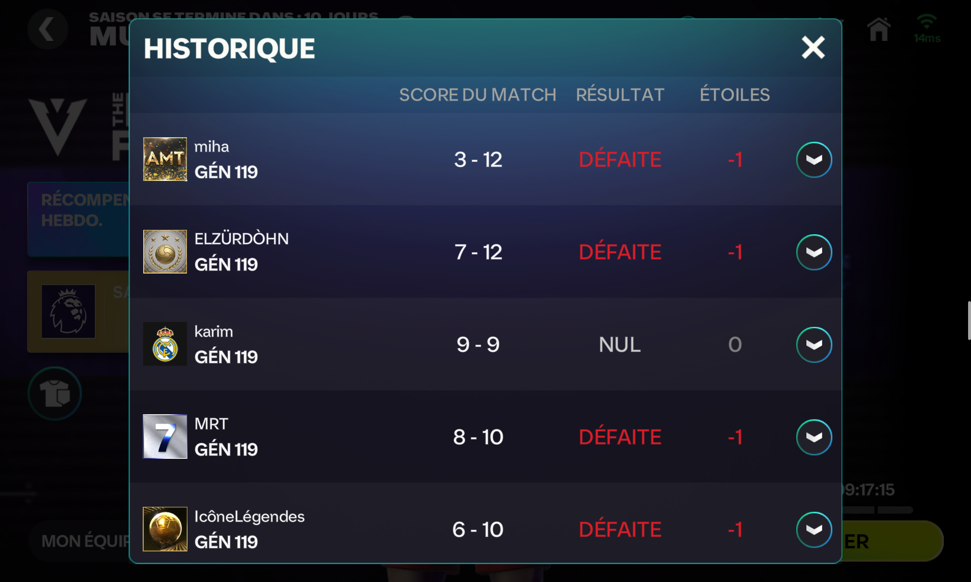 Ont arrive à un moment ont vous dégoûte de jouer a constamment affronter des équipes bien trop souvent nettement supérieur en gen . Et donc forcément a te prendre des branlés logique tu joue contre des équipes plus forte sans aucun recours ni aucune solution concrète et intelligent, vu les réponses données par les conseillers qui sont DÉPLORABLE. Tu touche péniblement un pauvre malheureux gen 120 avec difficulté sa y es tu changes de statut juste pour un joueur tu te paye des gens 119 120 qui eux pour avoir cette gen ont forcément plus de joueurs de niveau très haut et un niveau de jeu très élevé contre lequel tu ne peux absolument plus rivaliser. En début du nouveau je suis arrivé a 2 fois difficilement a 10 étoiles la c est bien fini 5 étoiles grand maximum et c est une descente infernale contre ces grosses équipes nettement supérieur donc avantagé par leur puissance. Les résultats sont là sont claires la jouabilité, l'intérêt du jeu perd de la crédibilité au profil de certains adversaires, et un vrai manque de visibilité sur le réels problème le manque de jouabilité, le manque de niveau, la difficulté a récupérer de bon éléments etc des problèmes dont souvent parle certains fans dans leurs commentaires, mais dommage vous n' en tenez pas compte aux profits de certains adversaires et au détriment d autre joueur, peut être que vous avez des œillères dans les yeux . Parce que peut être sa vous arrange. Comment pouvez-vous nous donner envie de jouer de vous faire de la bonne pub dans de tels conditions