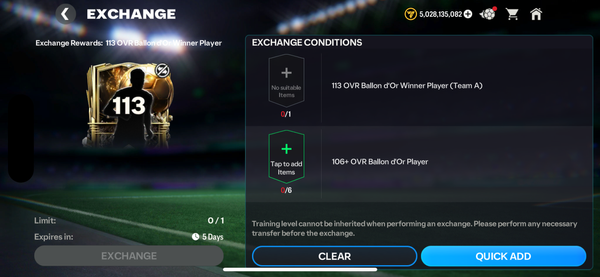 Hi - may well be me but is there an error here in game re the 113 OVR exchange in ‘Exclusives’ section? I have a 113 base OVR Zidane in my team but also packed another, but the exchange isn’t recognising it.