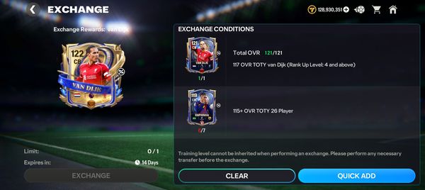 Dear players and ea staff. Today i did the 115 toty player pick in order to collect 115+ players to put in the 117 utoty van dijk exchange. From the pick i got 115 honourable mention salah. When i tried to put him in the exchange i couldn't. Its totally unacceptable to label a player as a toty player and then not being able to exchange him. Please fix this issue as soon as possible