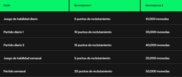 Juega partidos diarios y juegos de habilidad para ganar puntos de reclutamiento. Todas las semanas habrá un juego de habilidad y un partido adicional disponibles.