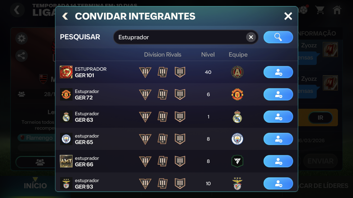 • Já denunciei muita Liga com nome r4cista, homofóbico, etc. Acredito que se a EA não solucionar, o próximo passo é reunir prints (provas) e levar diretamente ao Ministério Público Federal. Não é aceitável esse comportamento. Não vamos naturalizar violência dentro do jogo. 👊
