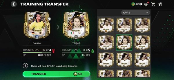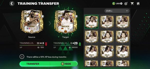 Оттуда выберите целевого игрока, который унаследует тренировочный опыт вашего исходного игрока. После того, как вы выбрали целевого игрока, нажмите «Трансфер», чтобы завершить тренировочный трансфер.