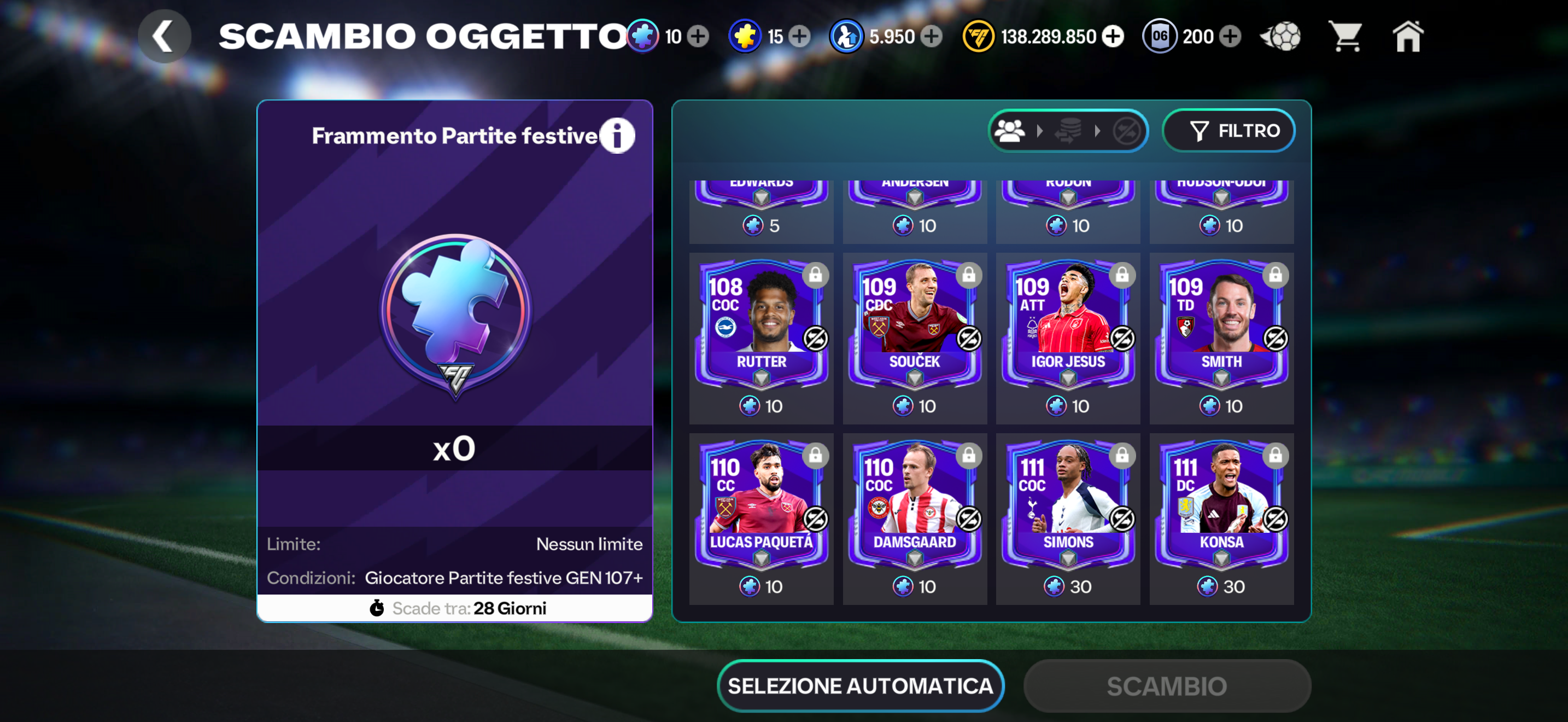 Ciao ragazzi volevo chiedere …. Come mai è dall evento capitani che non ricevo più un giocatore di OVR massimo? È veramente frustrante riuscire a prendere i giocatori solo con lo scambio dei punti scambio di quell evento …… ho amici che ricevono molte buone carte io non sto ricevendo niente da mesi. Ho letto che se una persona apre il pacchetto da 3000 gemme tutti i giorni per tutto un evento riceve come minimo 2 giocatori OVR massimo nel caso di adesso minimo un 114e un 115 ….:: come ripeto io è dall evento capitani che non ricevo più niente