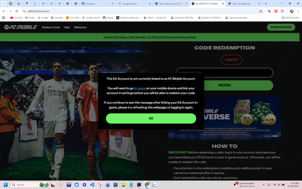 I cannot Redeem code for my EA Account. I used Facebook Account to register and sign for THE FIRST TIME I play the game FC MOBILE, I dont know about your policies.