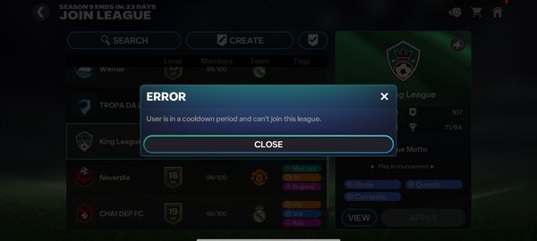 - @akbmjqtzxnx2 You are in cooldown because you left a league while active in a tournament - when the tournament ends you can join another league
