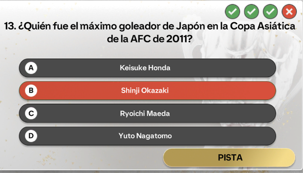 En la 4ta pregunta del evento la historia de una nación ,esta mal planteado las alternativas ,tanto Maeda y Okazaki hicieron 3 goles y son los máximos goleadores de la copa asiática afc del 2011, y no soy el único hay varios jugadores que también tuvieron este percance ,por favor arréglenlo y denos las recompensas que nos merecemos.