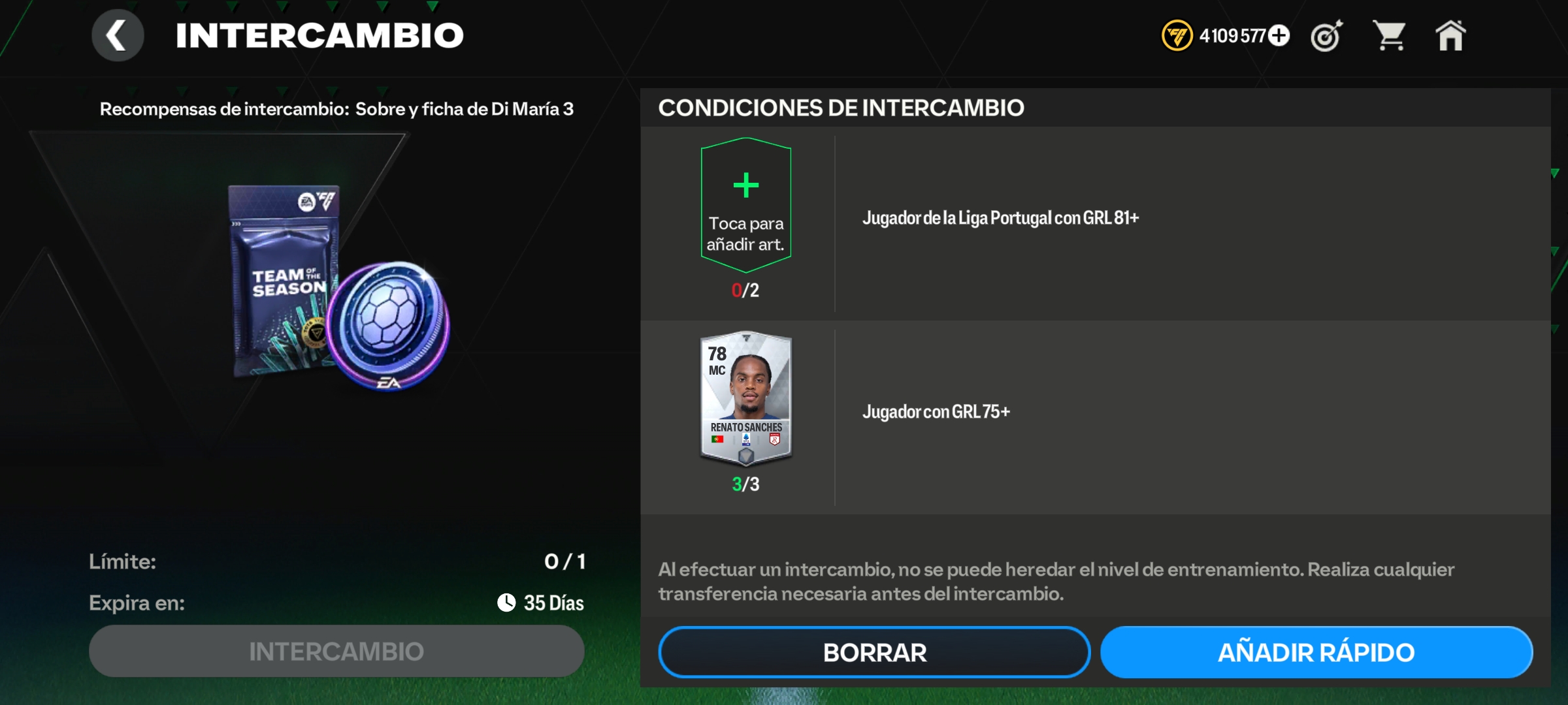 hay un problema en el intercambio de Di Maria, me pide un jugador de la Liga Portugal de 88+ GRL, el cuál tengo, pero me sale que no tengo tal jugador, y es el último intercambio que me falta