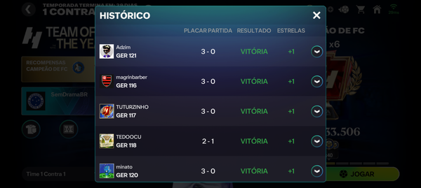 Nota de Atualização: Após eu denunciar partida, o sistema do FC Mobile conseguiu de forma retroativa recuperar minha vitória e minha estrela. Segue print com a vitória que não tinha sido contabilizada no modo 1 contra 1.