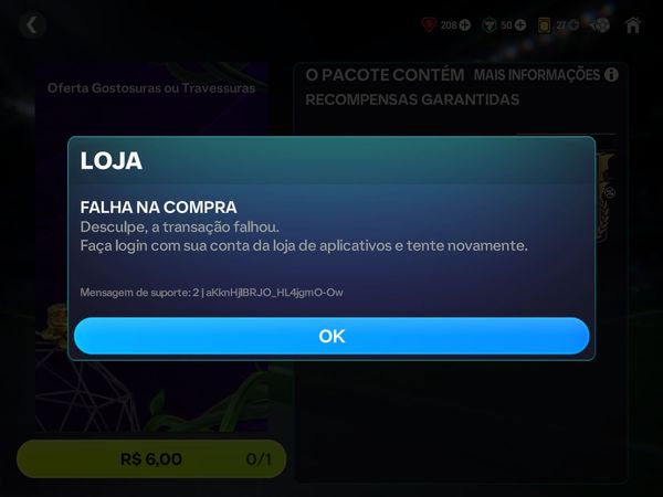 Ao efetuar a tentativa de compra do pacote especial do Iniesta (107, Halloween), o jogo apesentou erro na compra, conforme o print abaixo: