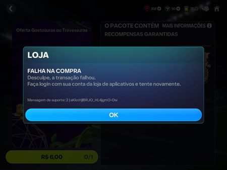 Ao efetuar a tentativa de compra do pacote especial do Iniesta (107, Halloween), o jogo apesentou erro na compra, conforme o print abaixo: O pacote é de compra única, ainda assim, foi descontado...