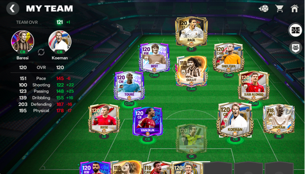 A terceira foto, mostra eu realizando a troca dos jogadores, e no canto superior da imagem, o overall aumentando para 121.