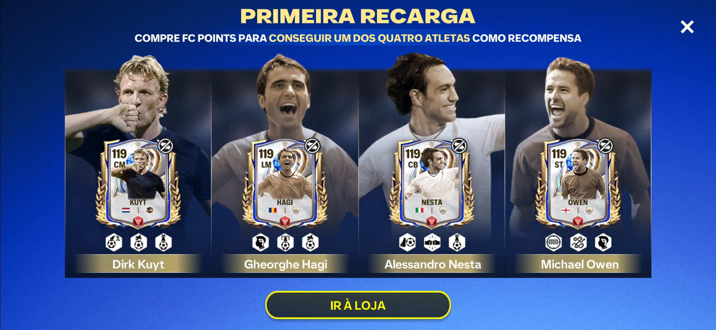 Olá boa noite. Eu tenho 2 contas no jogo fc mobile 26. A principal e a secundaria. Todo evento chega o pacote de primeira recarga para as duas contas. Porém nesse novo evento toty. A oferta de primeira recarga chegou somente para minha conta secundária. A oferta mostra que qualquer quantia em fc pontos você poderá escolher entre 4 cartas.