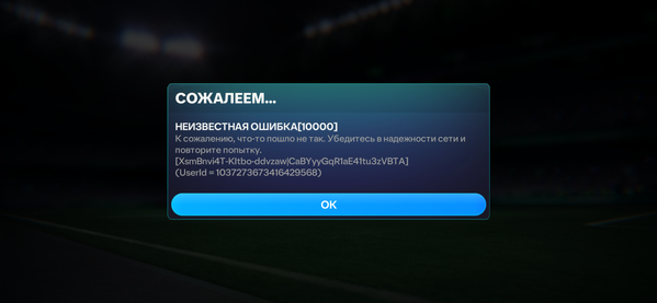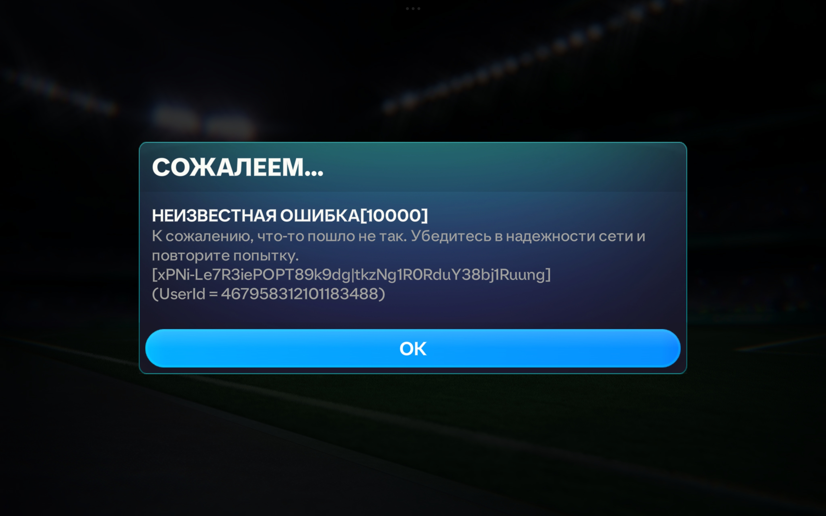 Когда пытаюсь войти в любую лигу, выдает ошибку: Сожалеем... Неизвестная ошибка 10000. Помогите решить проблему пожалуйста.(Это не из-за сети или устройства, потому что на другом аккаунте все работает)