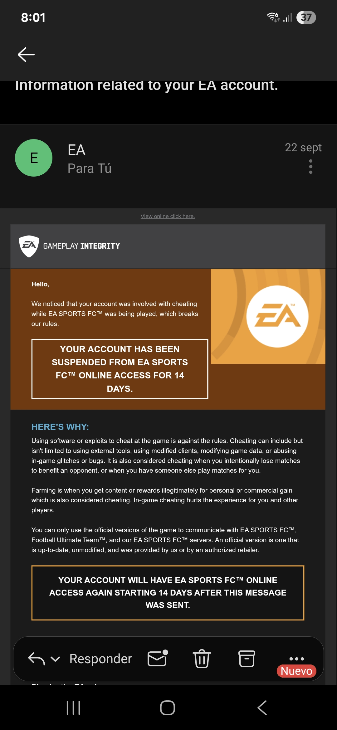 Me banearon injustamente por culpa de un hacker que me robo la cuenta.El ban comenzo el 22 de septiembre y ponia que duraba 14 dias.Han pasado 15 días y sigo baneado y nadie de EA se pone en contacto conmigo.Esta empresa es la peor que he visto en videojuegos.