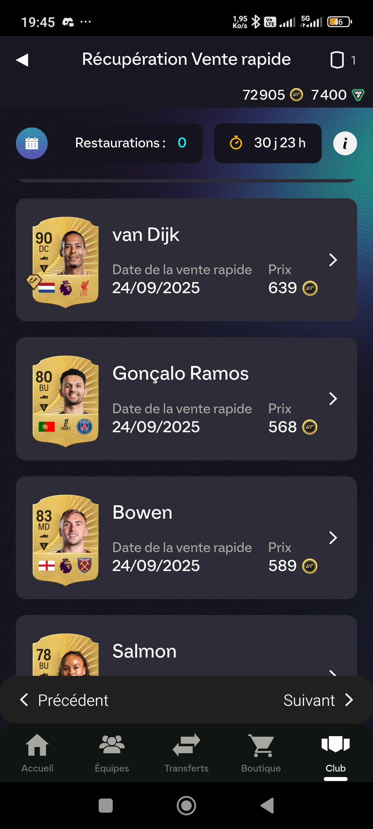 Bonsoir j'ai eu un bug sur les coups de 19h le 24/09/2025 ouverture de pack toute ma liste et partie en vente rapide impossible d'annuler redémarrage de la Playstation 5 et toute la Liste de transfert était en vente rapide avec des joueurs qui coûte 200 000 crédit merci de me contacter pour m'aider cordialement Romuald TOMEZYK