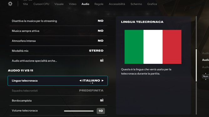 Ho comprato ora il gioco FC 26 ho installato il gioco ma la telecronaca è solo inglese e francese italiano non mi da nessuna disponibilità come posso fare per averla