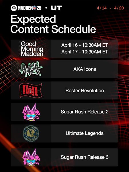 NatureBoy2323Hero+9 months agoExpected Content Schedule for Madden Ultimate TeamFor the Week of 4/14-4/20 Reminder: Sugar Rush Eggs are targeted to hatch this Sunday!