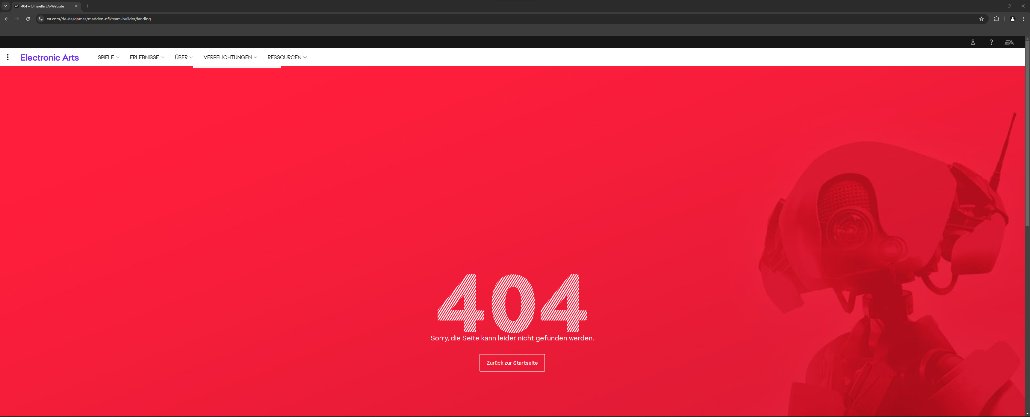 I wanted to try out Madden Teambuilder today. Unfortunately I always get a 404 error page. I've also tried using a VPN and a US IP address. But I am always redirected directly to the German site.https://www.ea.com/de-de/games/madden-nfl/team-builder/landing