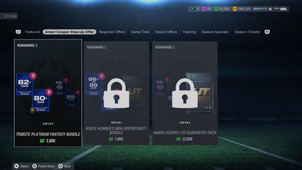 I never intended to buy the first two packs as I could not spend more money. Now I am in limbo. 12,000 points with no other pack I want nor enough to finish the steps, $100 gone, and a roster without Amari Cooper.