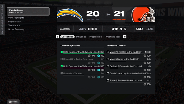 wombatvvvSeasoned Novice1 month agoBug Report: Superstat Coach ObjectivesBug Report: Coach objective "Hold Opponent to 350 yards or less".Opponent is reported as having gained 0 yards. Obviously wrong.The "Hold Opponent to 350 yards or less" is reported twice on the objectives screen. Madden NFL 26 2025-12-17 10_02_29.png2.6 MB